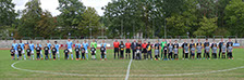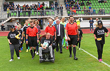 Für alle Besucher - mit Handicap und ohne – war der Einlauf beider Mannschaften das große Highlight. Begleitet wurden die Spieler von behinderten Jugendlichen der Lebenshilfe und nicht behinderten Kindern des FC Eintracht. Eine große Ehre wurde Christian Undiener zuteil, der den Spielball auf seinem Rollstuhl zum Anstoßpunkt brachte. Mit diesem symbolischen Akt des inklusiven Miteinanders berührte das Projekt ginaS von Beginn an die Herzen aller Zuschauer, Helfer und Sportler.