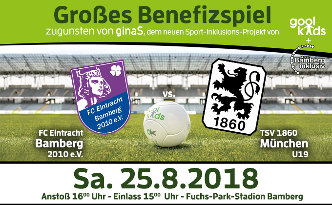 Dass der Ball 90 Minuten rollte, war Nebensache. Dass die Lokalmatadoren des FC Eintracht Bamberg mit 1:3 verloren, ebenso. Dass so viele Menschen im Bamberger Fuchs Park-Stadion zusammengekommen sind, um sich für ein starkes Miteinander einzusetzen, war dagegen die Hauptsache. Etwa 350 Zuschauer wohnten dem erwartet offenen und inklusiven Fest bei: dem Benefizspiel zwischen dem FCE und den Junglöwen des TSV 1860 München. Eingeladen hatte der Förderkreis goolkids, um das Sport-Inklusions-Projekt ginaS vorzustellen.