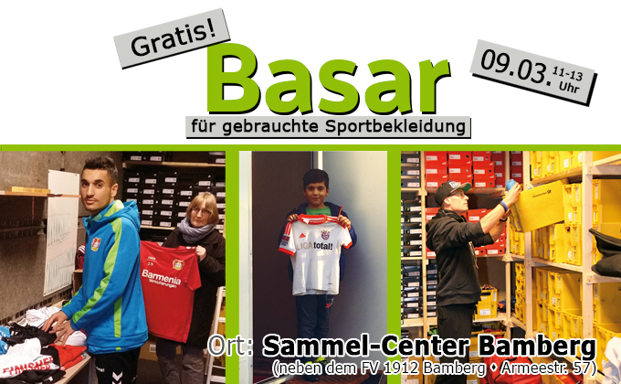 Neu aufgestellte Sammelboxen bilden die Grundlage für den akuten Vereinsbedarf und sind Wegbereiter für den nächsten "Gratis-Basar" für Sportsachen. Diese finden zusätzlich zu den regulären Öffnungszeiten des Sammel-Center, neben dem Vereinsheim des FV 1912 Bamberg (jeden Montag von 15 bis 17.30 Uhr) in unregelmäßigen Abständen statt. Je fleißiger in den Vereinen gesammelt wird, desto größer wird die Auswahl beim "Gratis-Basar" sein und desto mehr Nachwuchs können wir bei der Suche nach Ausrüstung unterstützen. So entwickelt sich der "Gratis-Basar" zur festen Institution in Bamberg.